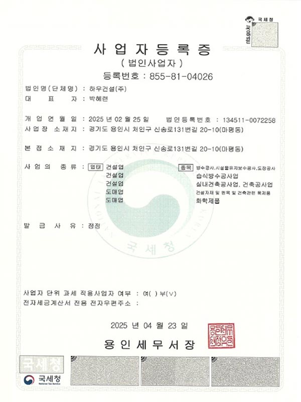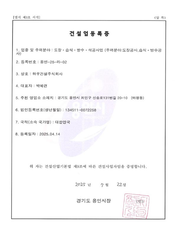 현재 하우건설(주)는 방수·도장 분야에서 축적된 전문성과 경험을 바탕으로, 보다 완성도 높은 시공과 차별화된 기술력을 제공하는 전문 건설회사로 자리매김하고 있습니다. 특히 폴리우레아 방수 공법을 비롯한 다양한 현장 경험을 통해 고객의 요구에 최적화된 솔루션을 제시하고 있으며, 어떠한 현장에서도 책임 있는 시공으로 최상의 결과를 만들어가고 있습니다.