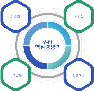 또한 ‘상생’과 ‘정도경영’을 기업 이념으로 삼아 협력사와 함께 성장하는 건강한 건설 문화를 만들어가고 있으며, 지속적인 연구개발과 기술력 향상을 통해 보다 안전하고 완성도 높은 시공 품질을 제공하기 위해 노력하고 있습니다. 고객과의 신의와 신뢰를 무엇보다 소중히 여기며, 단순한 시공을 넘어 오래도록 믿고 맡길 수 있는 파트너가 되고자 합니다.